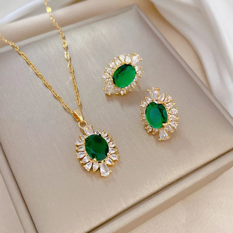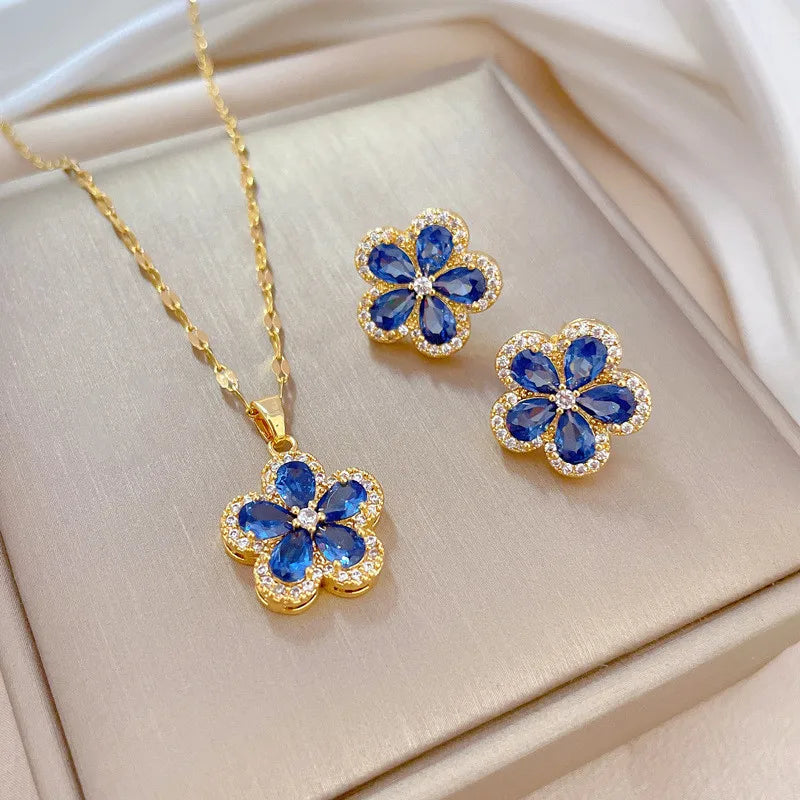Conjuntos de joias de zircônia camélia de alta qualidade, aço inoxidável, pingente de flor da moda, colar, brincos, presentes de festa para mulheres e meninas
